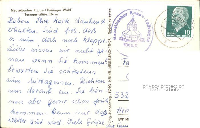 71918692 alte Postkarte Meuselbach-Schwarzmuehle Kuppe Turmgasstaette postalisch gelaufen Erhaltung siehe scans KatCode: 11110016073056