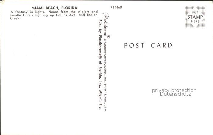 72161957 Miami Beach Algiers Hotel Seville Hotels Indian Creek at night postalisch nicht gelaufen Erhaltung siehe scans KatCode: 14140110000000