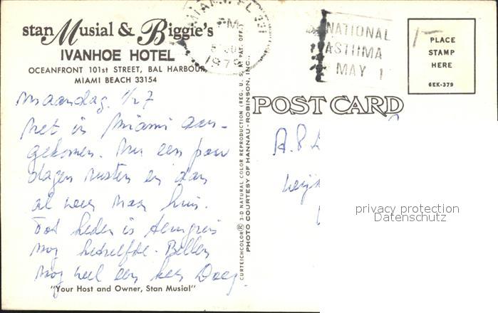 72285145 old postcard Miami Beach Bal Harbour Ivanhoe Hotel PoolSTrand postalisch gelaufen Erhaltung siehe scans KatCode: 14140110000000