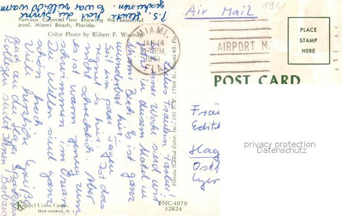 73051302 old postcard Miami Beach Colonial Inn Schwimmbad postalisch gelaufen Erhaltung siehe scans [KathaD81] KatCode: 14140110000000