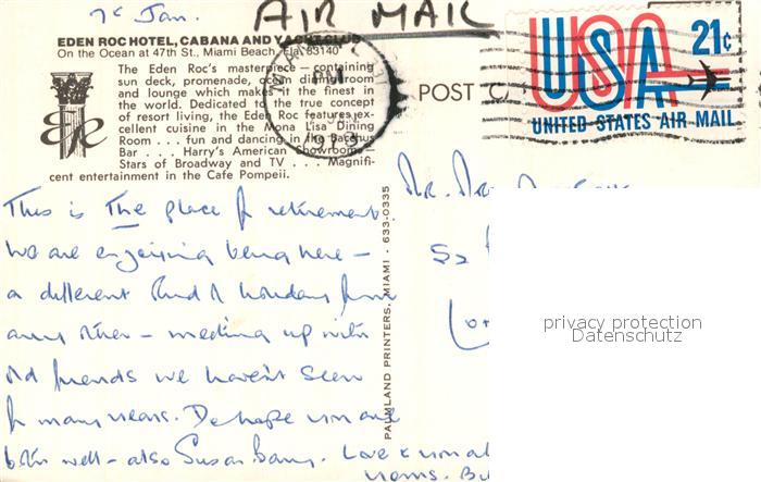 73127732 old postcard Miami Beach Eden Roc Hotel Cabana postalisch gelaufen Erhaltung siehe scans [KathaD81] KatCode: 14140110000000
