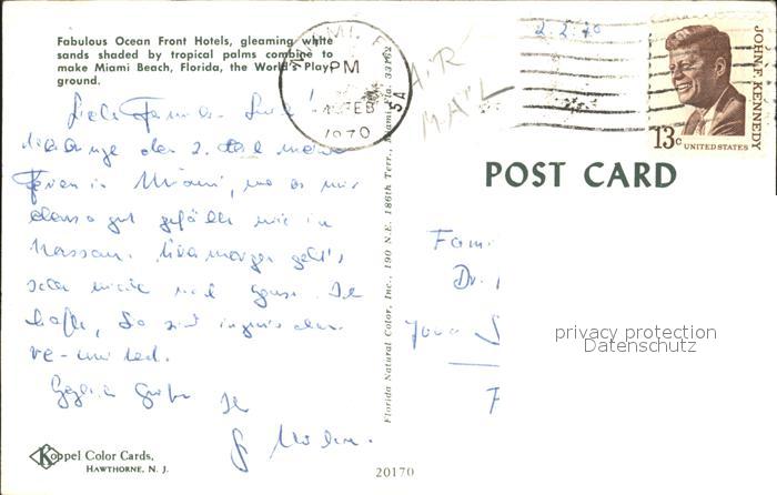 72283300 old postcard Miami Beach Fabulous Ocean Front Hotel postalisch gelaufen Erhaltung siehe scans KatCode: 14140110000000