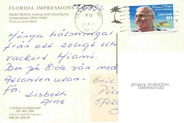 74148752 old postcard Miami Beach Florida USA Florida Impressions Fontainebleau Hilton Hotel aerial view postalisch gelaufen Fliegeraufnahme Erhaltung siehe scans [FriedD77] KatCode: 14140110000000