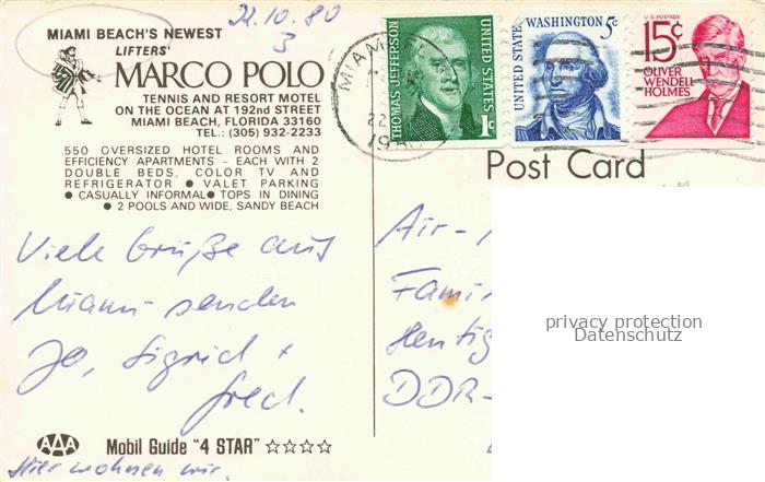 74091312 old postcard Miami Beach Florida USA Marco Polo Tennis and Resort Motel postalisch gelaufen Erhaltung siehe scans [IrynaD87] KatCode: 14140110000000