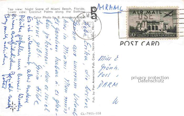 74128745 old postcard Miami Beach Florida USA Night Scene Coconut Palms along the beach postalisch gelaufen Erhaltung siehe scans [FriedD77] KatCode: 14140110000000