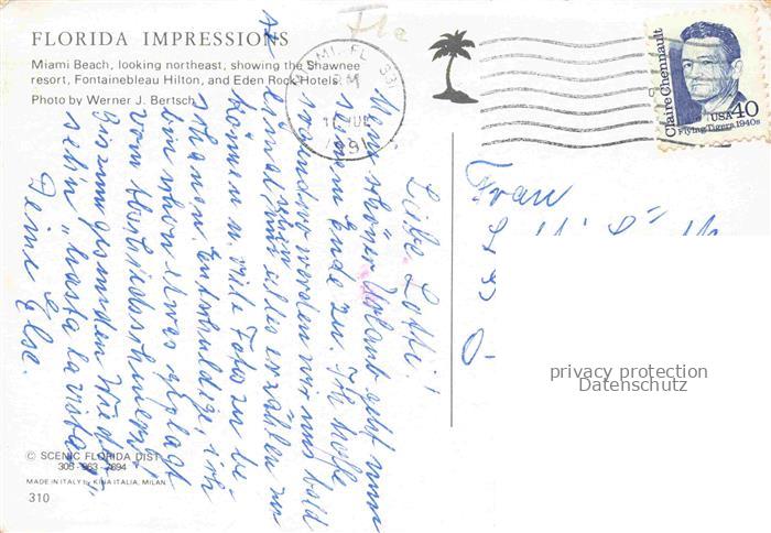 74093047 old postcard Miami Beach Florida USA Shawnee resort Fontainebleau Hilton and Eden Rock Hotels Fliegeraufnahme postalisch gelaufen Erhaltung siehe scans [WerneD78] KatCode: 14140110000000