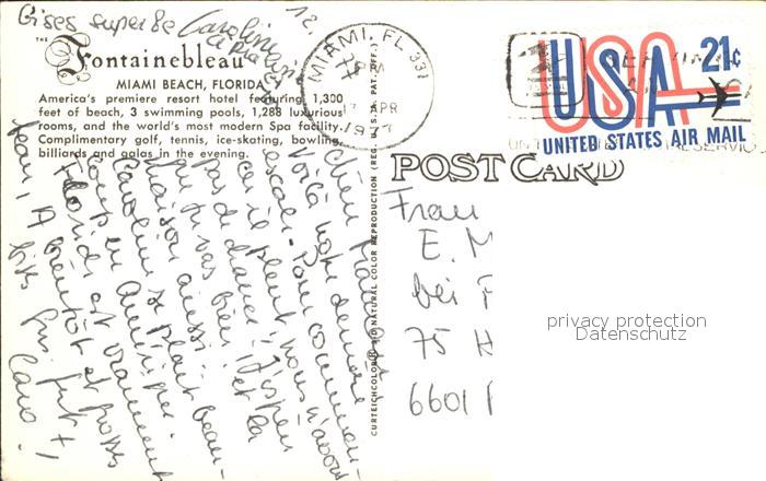 71967516 old postcard Miami Beach Fontainebleau postalisch gelaufen Erhaltung siehe scans KatCode: 14140110000000