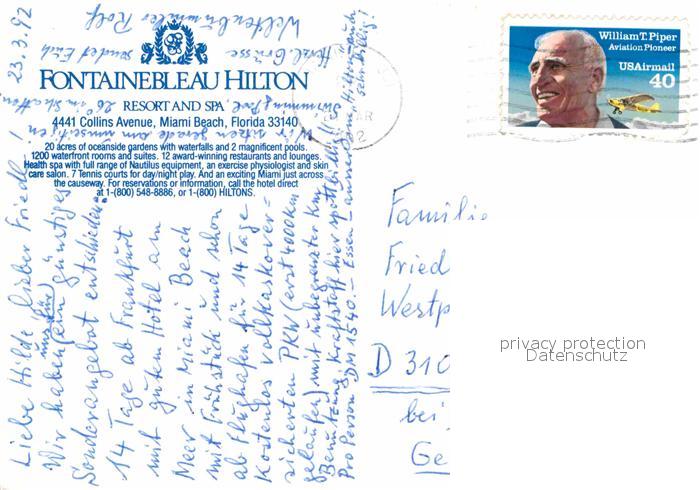 72795864 old postcard Miami Beach Fontainebleau Hilton postalisch gelaufen Erhaltung siehe scans [KathaD81] KatCode: 14140110000000