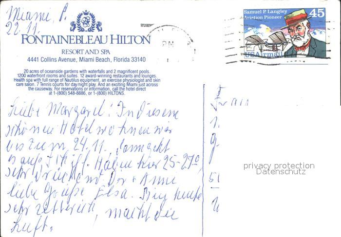 71847850 old postcard Miami Beach Fontainebleu Hilton postalisch gelaufen Erhaltung siehe scans KatCode: 14140110000000