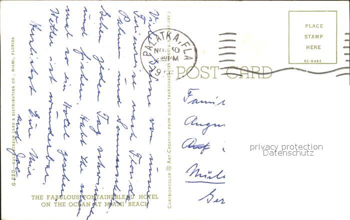 71919110 old postcard Miami Beach Fontainebleu Hotel postalisch gelaufen Erhaltung siehe scans KatCode: 14140110000000