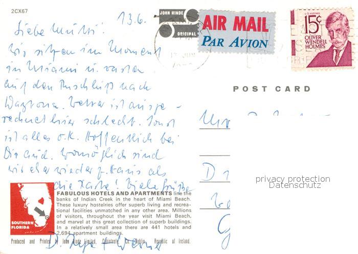 72929370 old postcard Miami Beach Hotel Indian Creek postalisch gelaufen Erhaltung siehe scans [NatalD47] KatCode: 14140110000000