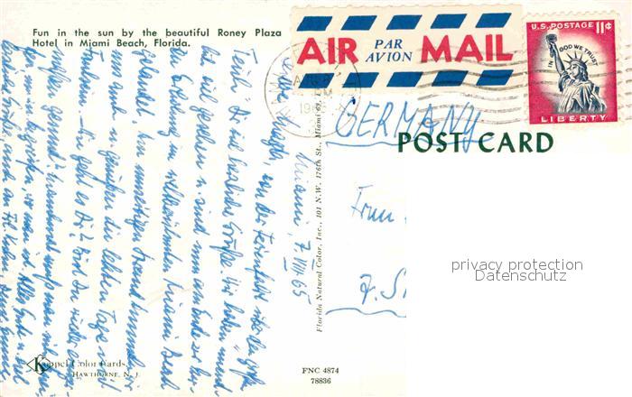 72843454 old postcard Miami Beach Hotel Roney Plaza postalisch gelaufen Erhaltung siehe scans [KathaD81] KatCode: 14140110000000