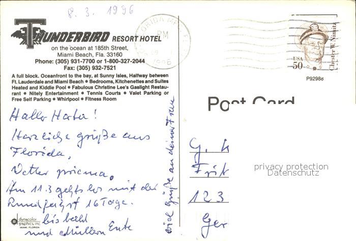 72921211 old postcard Miami Beach Hotel Thunderbird postalisch gelaufen Erhaltung siehe scans [LiesaD40] KatCode: 14140110000000