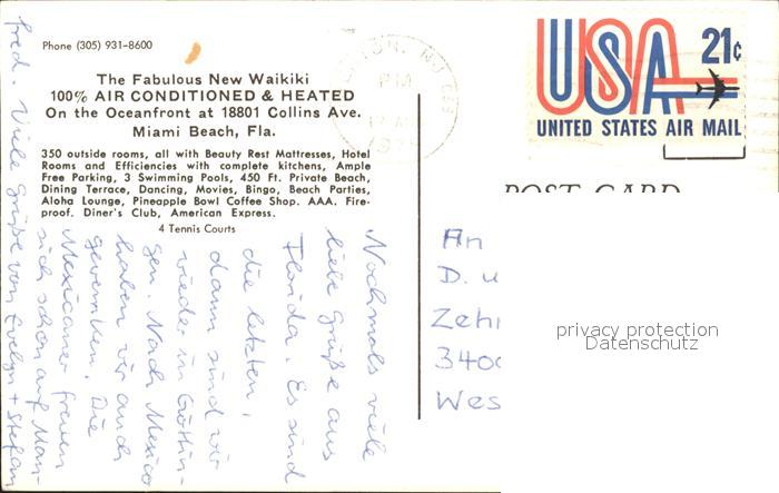 71953217 old postcard Miami Beach Hotel Waikiki postalisch gelaufen Erhaltung siehe scans KatCode: 14140110000000