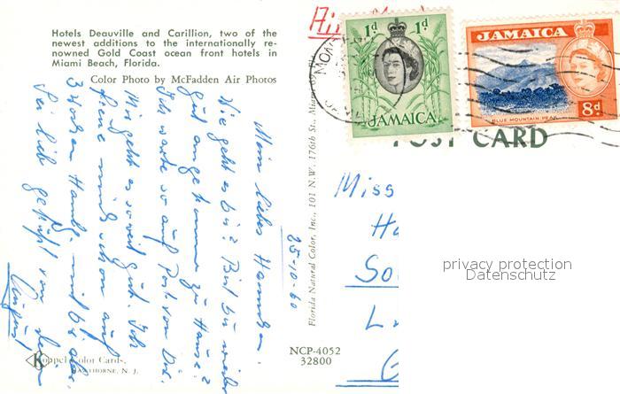 73573085 old postcard Miami Beach Hotels Deauville and Carillion aerial view postalisch gelaufen Erhaltung siehe scans [FriedD77] KatCode: 14140110000000