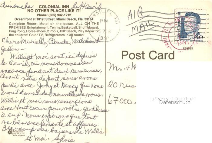 73661876 old postcard Miami Beach Motel Colonial Inn Swimming Pool Atlantic Ocean postalisch gelaufen Erhaltung siehe scans [FriedD77] KatCode: 14140110000000
