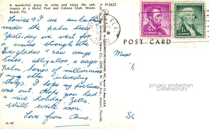 73130346 old postcard Miami Beach Motel Pool Cabana Club postalisch gelaufen Erhaltung siehe scans [NatalD47] KatCode: 14140110000000