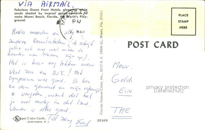 72421320 old postcard Miami Beach Ocean Front Hotels at night Beach postalisch gelaufen Erhaltung siehe scans KatCode: 14140110000000