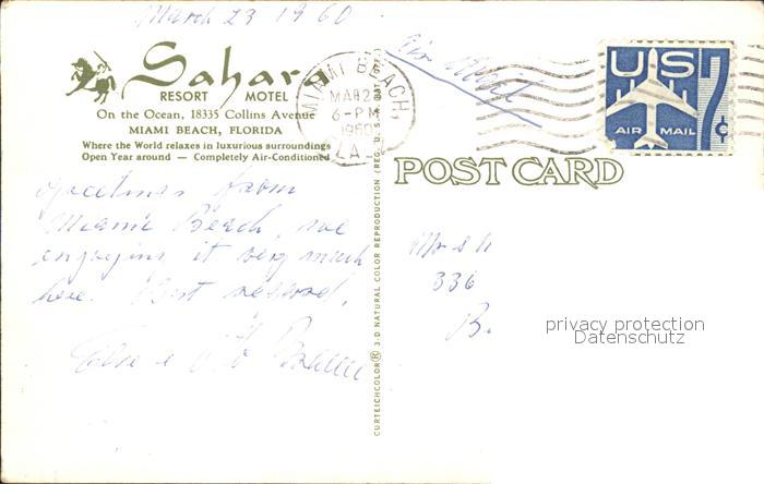 71953305 old postcard Miami Beach Sahara Resort Motel postalisch gelaufen Erhaltung siehe scans KatCode: 14140110000000