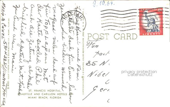 72271060 old postcard Miami Beach St Francis Hospital Beauville and Carillon Hotels postalisch gelaufen Erhaltung siehe scans KatCode: 14140110000000