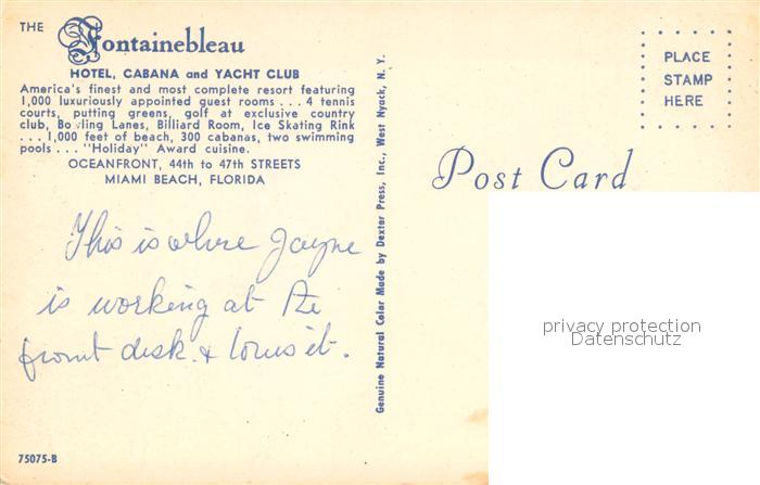 73646860 Miami Beach The Fontainebleau Hotel Cabana and Yacht Club postalisch nicht gelaufen Erhaltung siehe scans [WerneD78] KatCode: 14140110000000