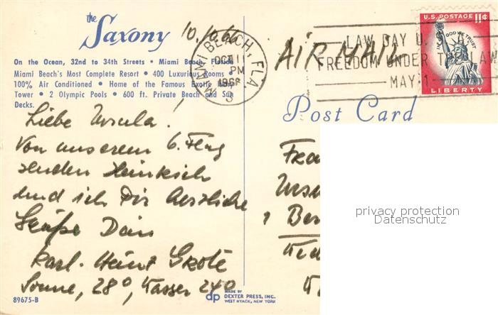 73646047 old postcard Miami Beach The Saxony Air view postalisch gelaufen Erhaltung siehe scans [WerneD78] KatCode: 14140110000000