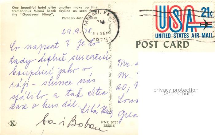 73295399 old postcard Miami Florida Fliegeraufnahme Miami Beach skyline Goodyear Blimp postalisch gelaufen Erhaltung siehe scans [KathaD81] KatCode: 14140110000000