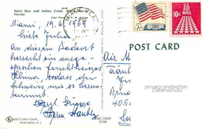 72671413 old postcard Miami Florida Hotel Row and Indian Creek postalisch gelaufen Erhaltung siehe scans [WerneD78] KatCode: 14140110000000