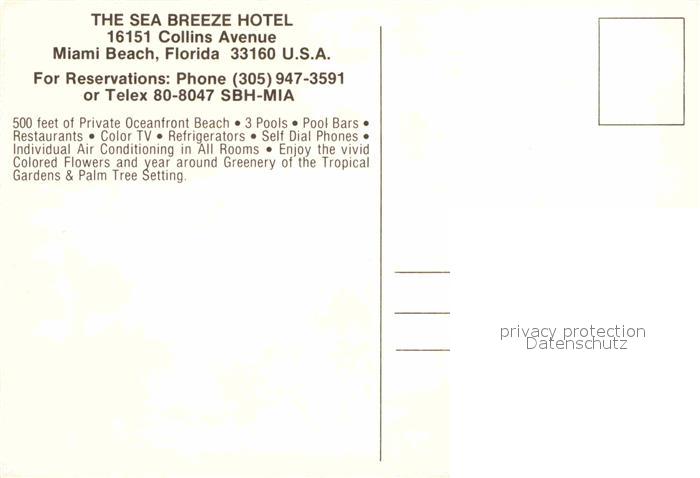 72881960 Miami Florida Hotel Sea Breeze postalisch nicht gelaufen Erhaltung siehe scans [AndreD76] KatCode: 14140110000000