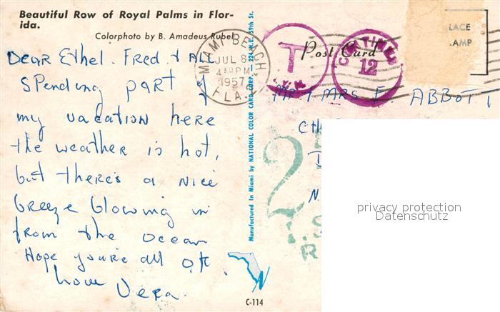 73061578 old postcard Miami Florida Row of Royal Palms postalisch gelaufen Erhaltung siehe scans [WerneD78] KatCode: 14140110000000