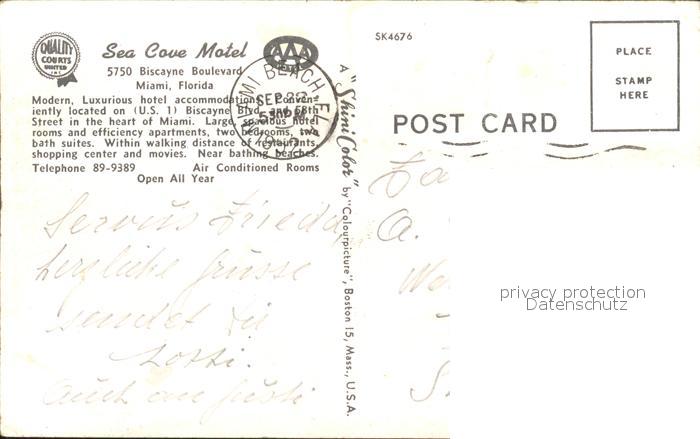 11686193 old postcard Miami Florida Sea Cove Motel postalisch gelaufen Erhaltung siehe scans KatCode: 14140110000000