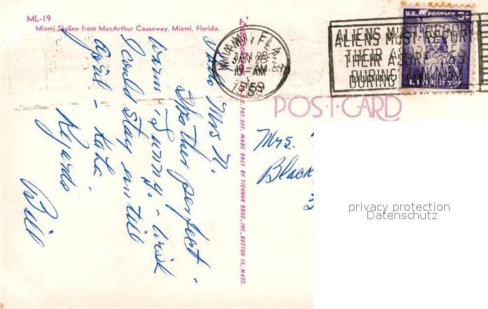 72956951 old postcard Miami Florida Skyline from MacArthur Causeway postalisch gelaufen Erhaltung siehe scans [FriedD77] KatCode: 14140110000000