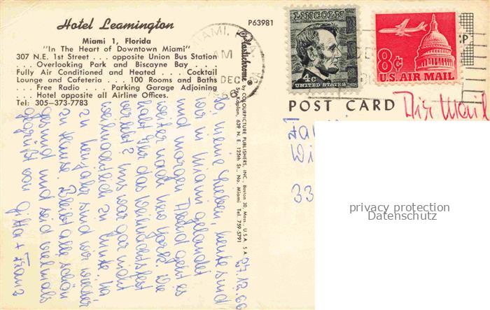 74043353 old postcard MIAMI Florida USA Hotel Leamington postalisch gelaufen Erhaltung siehe scans [FriedD77] KatCode: 14140110000000