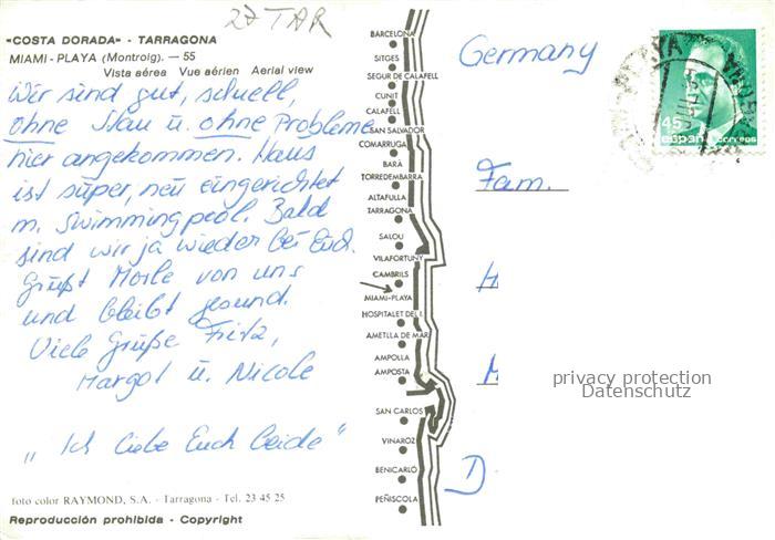 74156489 old postcard Miami Playa Tarragona Cataluna ES Apartments Hotels Strand Meer Hochhaeuser Strassen Baeume Kuestenabschnitt postalisch gelaufen Fliegeraufnahme Erhaltung siehe scans [Karloger] KatCode: 11510