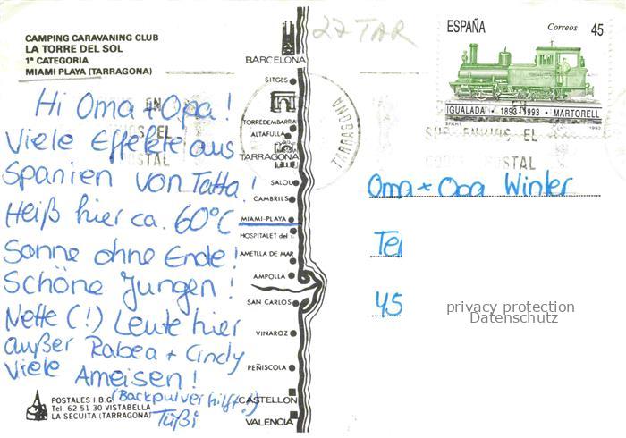 74156488 old postcard Miami Playa Tarragona Cataluna ES Camping La-Torre-del-Sol Caravaning Strand Meer Fliegeraufnahme Baeume Zelte Wohnwagen postalisch gelaufen Fliegeraufnahme Erhaltung siehe scans [Karloger] KatCode: 11510