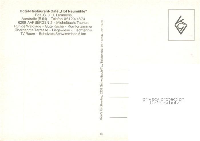 73654481 Michelbach Aarbergen Hotel Restaurant Hof Neumuehle Fremdenzimmer Terrasse postalisch nicht gelaufen Erhaltung siehe scans [FriedD77] KatCode: 11110006439001
