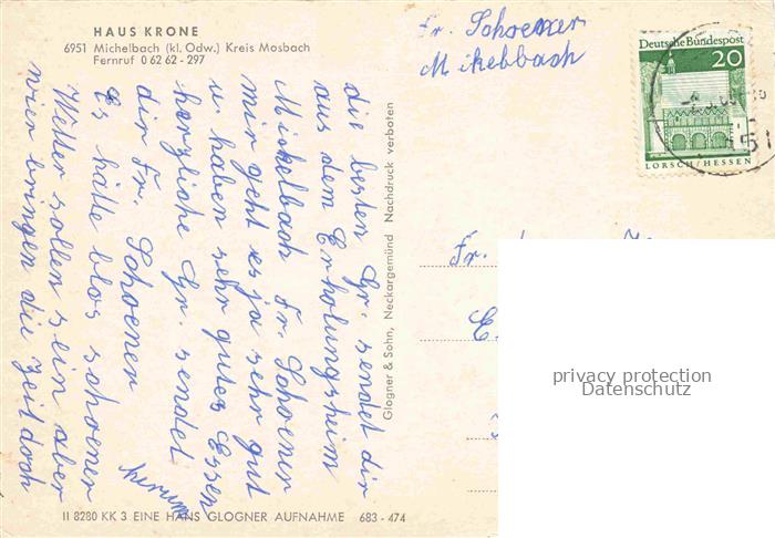 74048005 alte Postkarte Michelbach Mosbach Odenwald Hotel Gasthaus Krone Panorama Landschaft postalisch gelaufen Erhaltung siehe scans [FriedD77] KatCode: 11110008225058