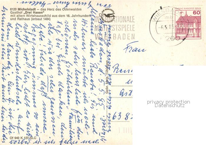 73295242 alte Postkarte Michelstadt Gasthof Drei Hasen mit altem Wirtshausschild und Rathaus postalisch gelaufen Erhaltung siehe scans [WerneD78] KatCode: 11110006437011