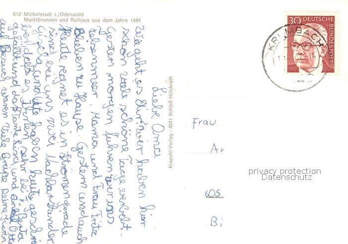 73269103 alte Postkarte Michelstadt Marktbrunnen Rathaus Cafe-Gaststaette postalisch gelaufen Erhaltung siehe scans [PaolaD17] KatCode: 11110006437011