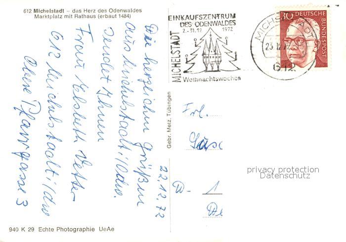 73127387 alte Postkarte Michelstadt Marktplatz mit Rathaus 15. Jhdt. Historisches Gebaeude Brunnen Kirchturm postalisch gelaufen Erhaltung siehe scans [FriedD77] KatCode: 11110006437011