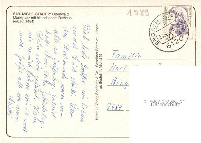 73067085 alte Postkarte Michelstadt Marktplatz Rathaus postalisch gelaufen Erhaltung siehe scans [NatalD47] KatCode: 11110006437011
