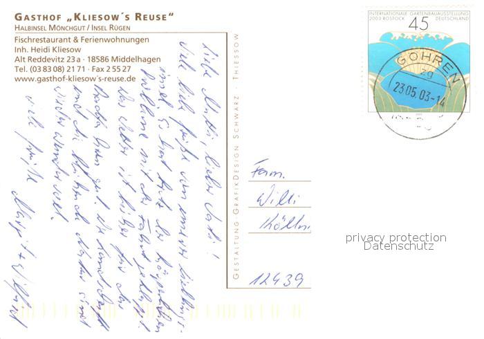 73641038 alte Postkarte Middelhagen Ruegen Gasthof Kliesows Reuse Bar Gaestezimmer postalisch gelaufen Erhaltung siehe scans [WerneD78] KatCode: 11110013061023