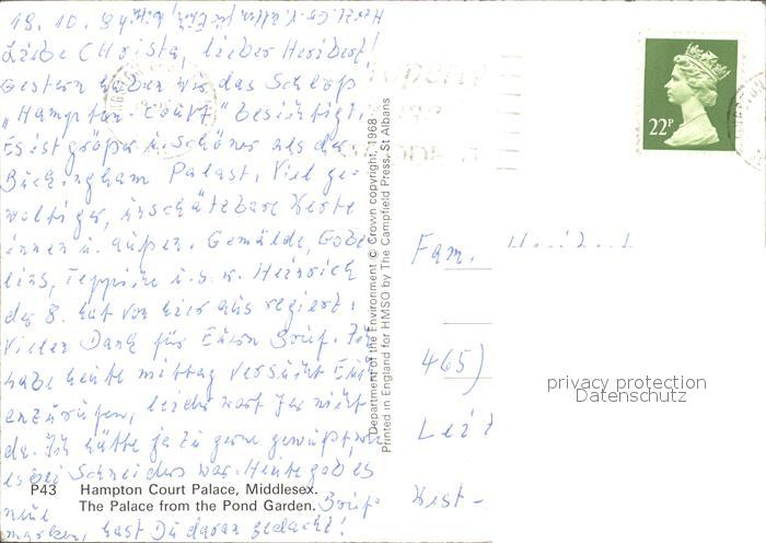 old postcard Middlesex Hampton Court Palace from the Pond Garden postalisch gelaufen Erhaltung siehe scans