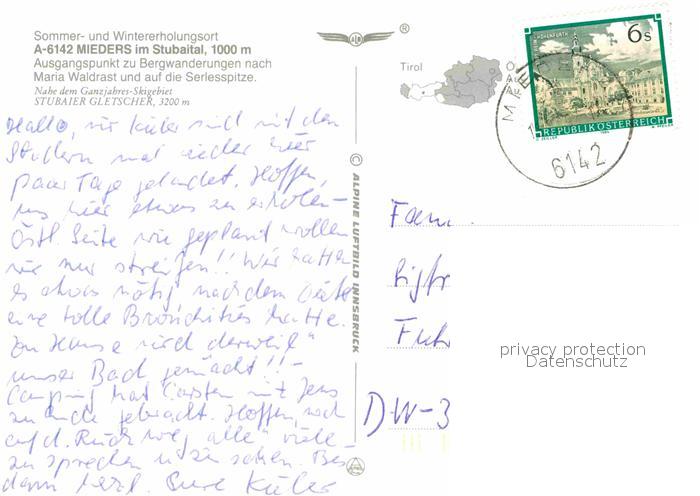 72755662 alte Postkarte Mieders Tirol Stubaital Fliegeraufnahme postalisch gelaufen Erhaltung siehe scans [WerneD78] KatCode: 11390332070328