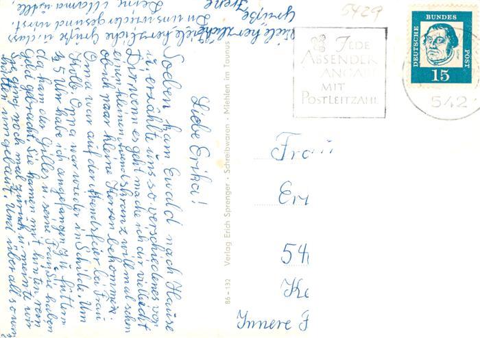 73891221 alte Postkarte Miehlen Taunus Panorama Rathaus Hauptstrasse Muehlbach Geburtshaus des Schinderhannes postalisch gelaufen Erhaltung siehe scans [WerneD78] KatCode: 11110007141085