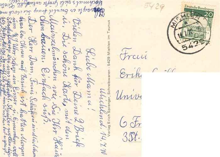 73891220 alte Postkarte Miehlen Taunus Rathaus Muehlbach Ev Kirche Neue Schule Panorama Gasthaus Zur Rose postalisch gelaufen Erhaltung siehe scans [WerneD78] KatCode: 11110007141085