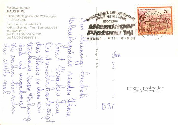 72763640 alte Postkarte Mieming Haus Riml postalisch gelaufen Erhaltung siehe scans [AndreD76] KatCode: 11390334070209
