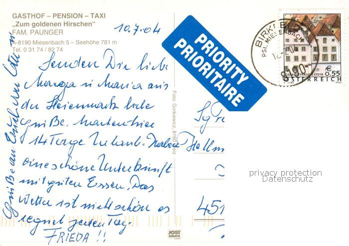 13189416 alte Postkarte Miesenbach Niederoesterreich Gasthof-Pension Zum goldenen Hirschen postalisch gelaufen Erhaltung siehe scans [PaolaD17] KatCode: 11390122032321