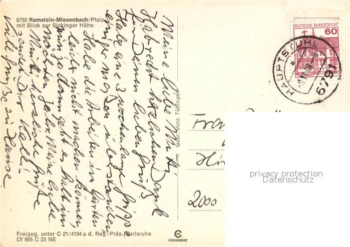 73667590 alte Postkarte Miesenbach Ramstein-Miesenbach mit Blick zur Sickinger Hoehe Fliegeraufnahme postalisch gelaufen Erhaltung siehe scans [FriedD77] KatCode: 11110007335038