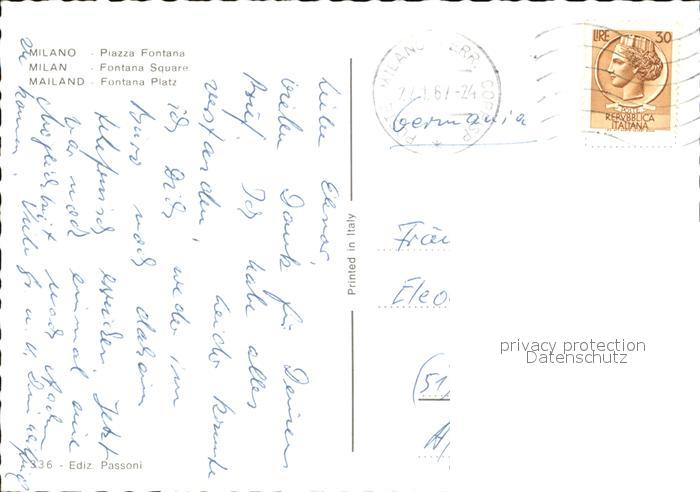 old postcard Milano Piazza Fontana postalisch gelaufen Erhaltung siehe scans